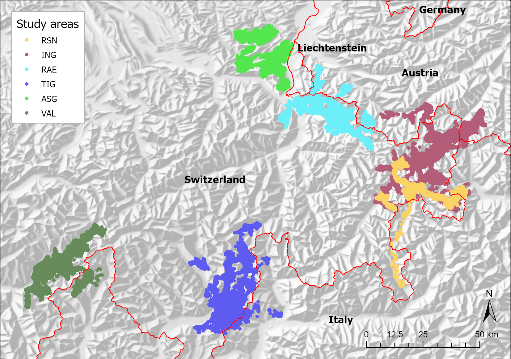 I used data from six telemetry studies across the Alps, i.e. from western Austria, northern Italy, Liechtenstein, as well as eastern and southern Switzerland (Figure 1). They cover montane to alpine habitats of red deer in a) inner alpine valleys of the east (studies RSN and ING, Swiss National Park with its surrounding areas in the canton of Grisons, Tyrol, the Autonomous province of Bolzano – South Tyrol and the province of Sondrio), and b) of the west (study VAL in the canton of Valais and the province Verbano – Cusio – Ossola), in c) the Swiss northeastern Pre-Alps and Alps (study ASG in the cantons of Appenzell Inner-Rhodes, Appenzell Outer-Rhodes and St. Gallen and study RAE with Liechtenstein, Vorarlberg and the canton of Grisons), and in d) the alpine south (study TIG in the cantons of Grisons and Ticino and provinces of Como, Lecco and Sondrio).