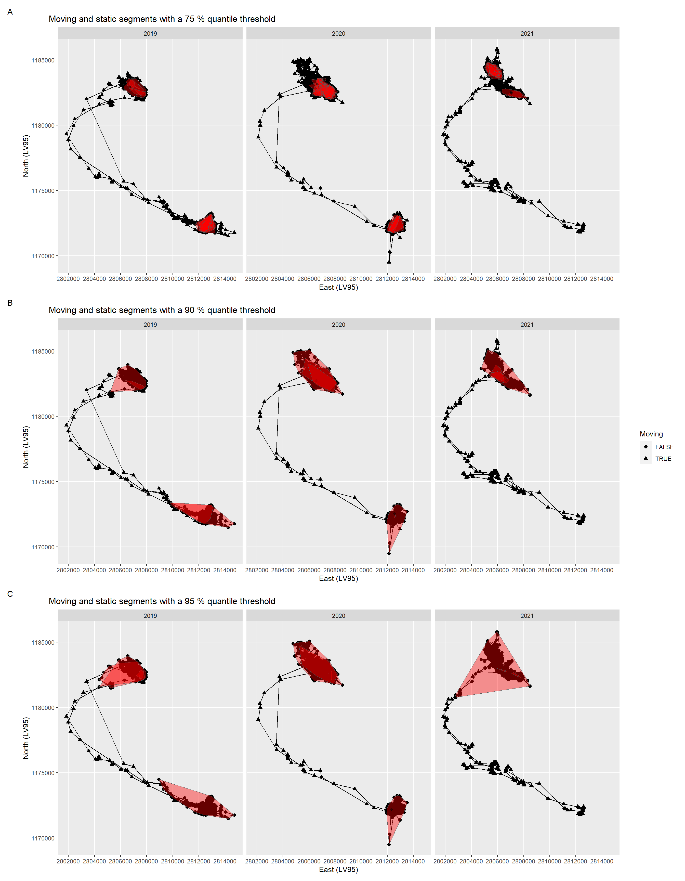 The female red deer with ID 20211 included data from the years 2019 to 2021 (Figure 3). As thresholds for the mean distances of the 30 days windows I calculated the 75 % quantile (953 m, A), the 90% (2904 m, B) and the 95 % (4747 m, C). Based on the static segments I calculated convex hulls per year, i.e. seasonal home ranges of ID 20211.