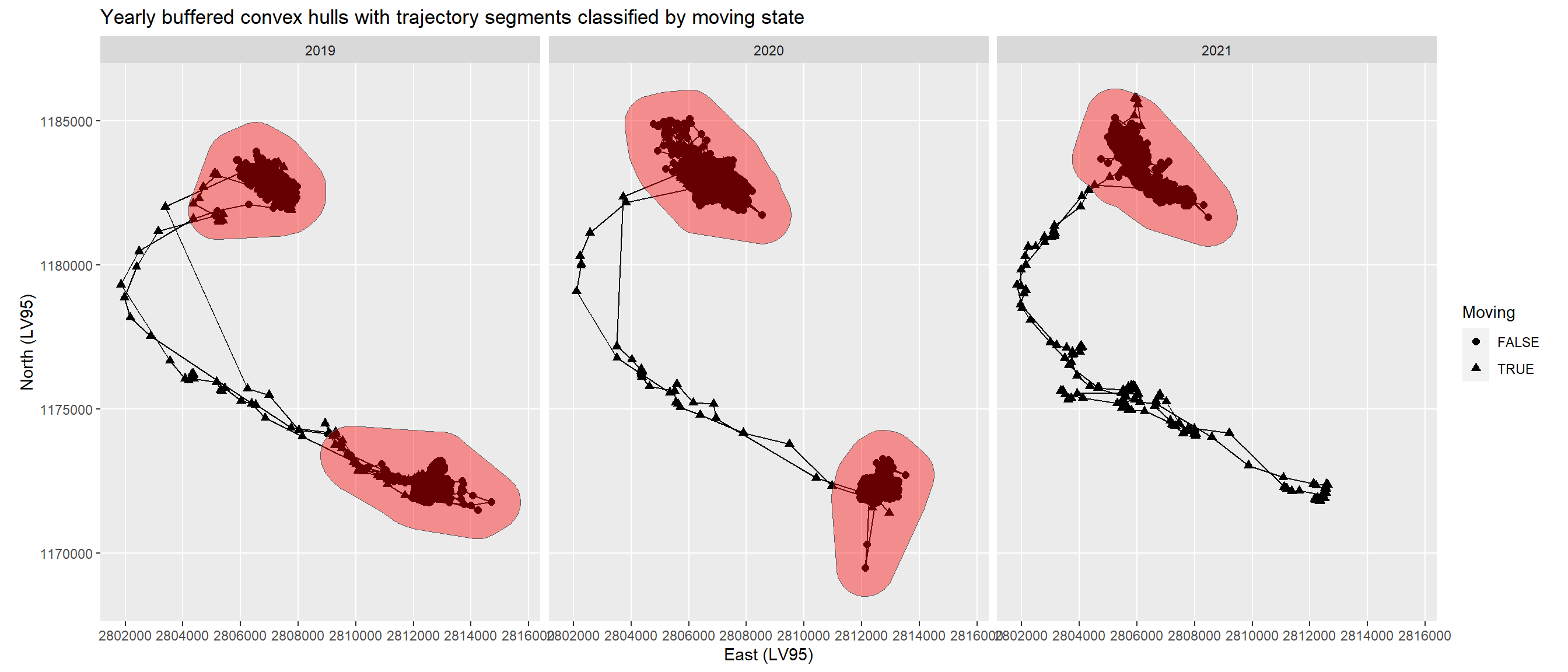 Merging and buffering the convex hulls of the static segments led to a winter and a summer home range in 2019 and 2020, and a winter home range only in 2021 (Figure 4).