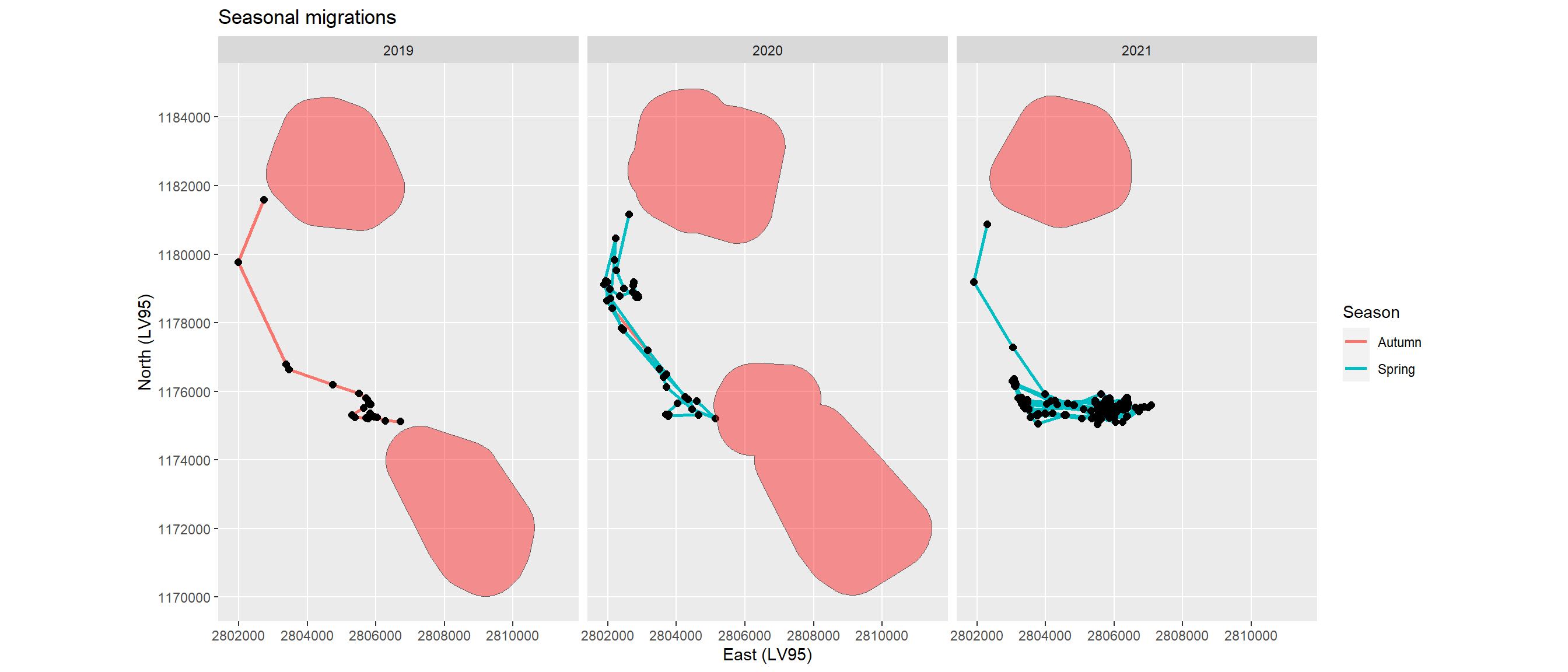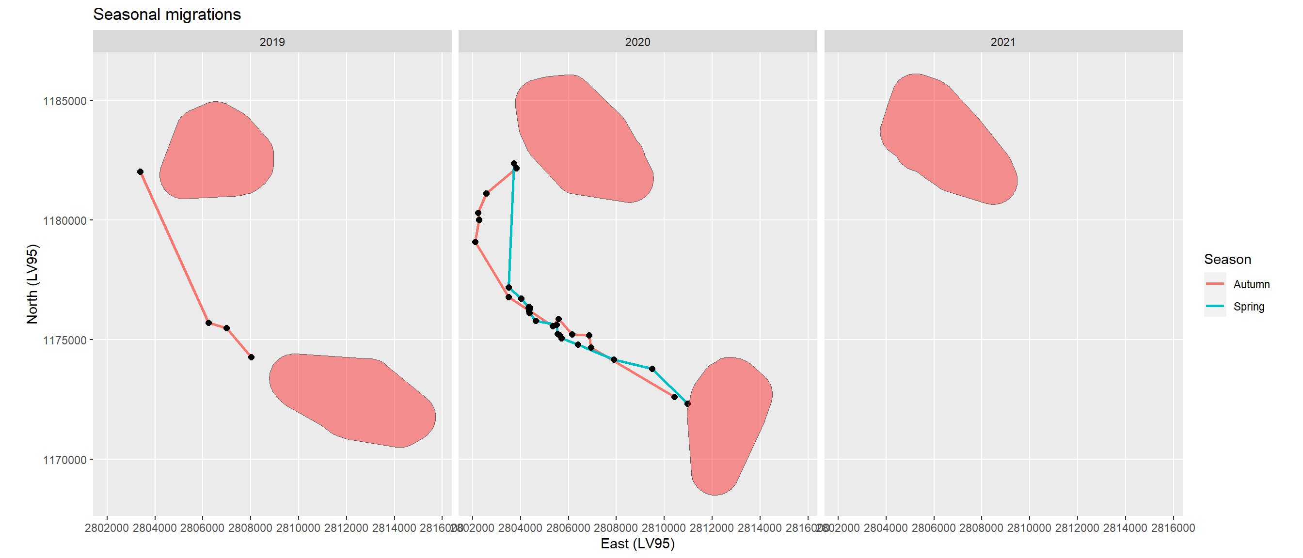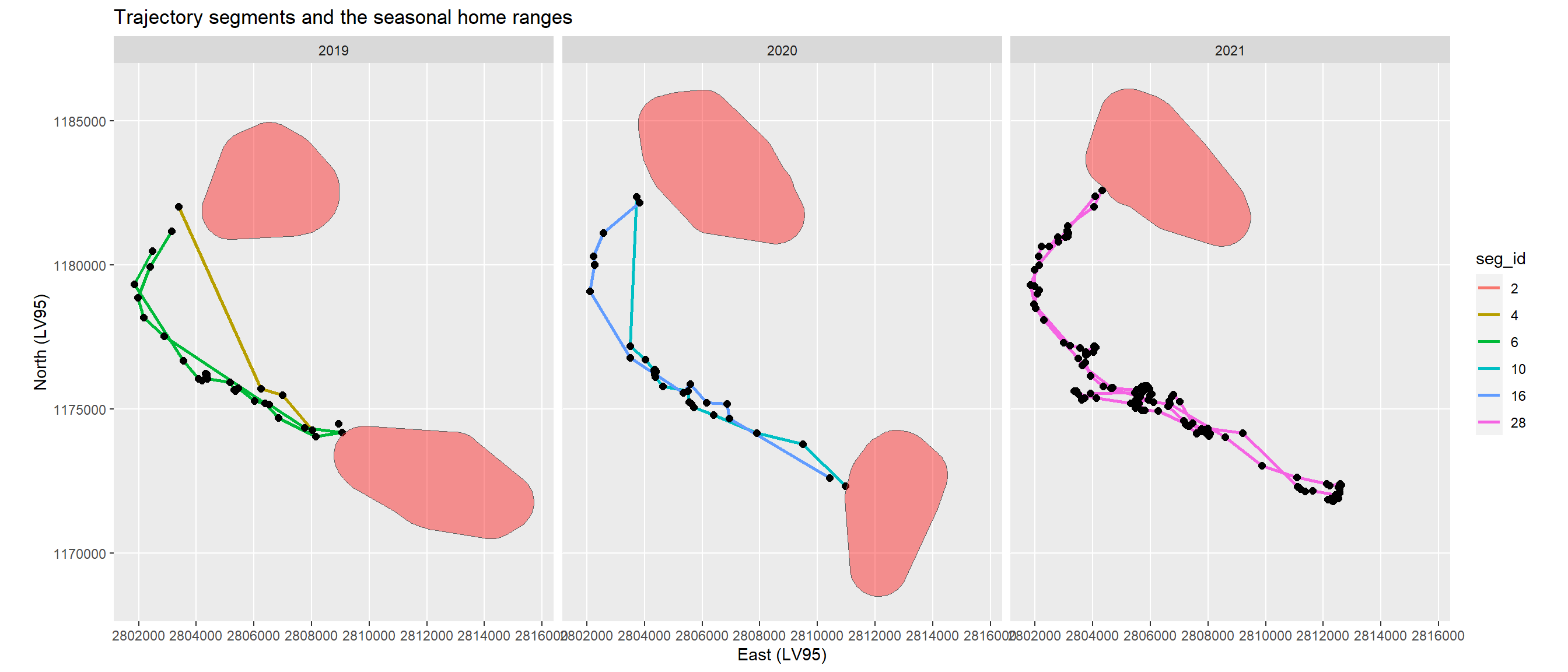 The resulting trajectory segments show the seasonal migrations in two of the tree years (Figure 6). In 2021 the migration from the winter to the summer home range had not yet started. Migration duration lasted only from 7 to 24 hours (Table 1).